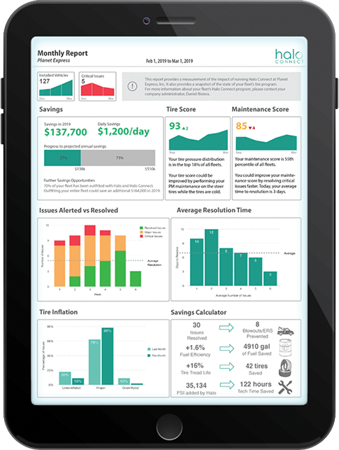 Halo Connect uses machine learning to deliver tire health, maintenance, and performance insights. Powered by billions of miles of real-world fleet tire data, Halo Connect by Aperia combines automatic tire inflation with predictive and prescriptive maintenance insights to reduce tire health issues, and allow tires to be maintained in the most efficient and economical way possible.